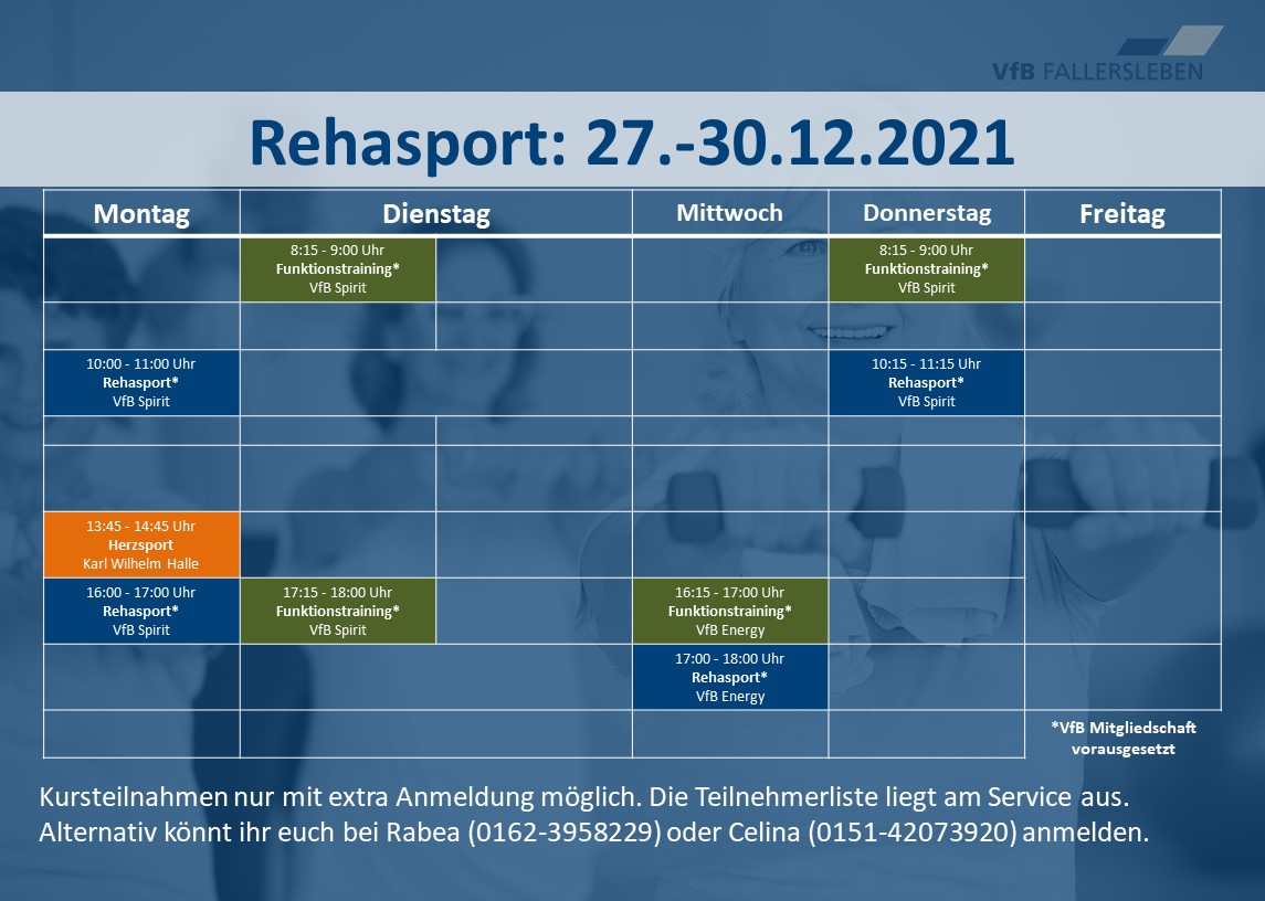 in diesem Jahr finden zwischen dem 27.12.2021 und 30.12.2021 Rehasportkurse für Vereinsmitglieder statt. Kursteilnahmen sind nur mit Extraanmeldungen möglich. Hierfür liegen Teilnehmerlisten im Service des VfB Fit aus, über die ihr euch eintragen lassen könnt. Alternativ kann die Anmeldung auch telefonisch über Rabea (0162-3958229) oder Celina (0151-42073920) erfolgen.